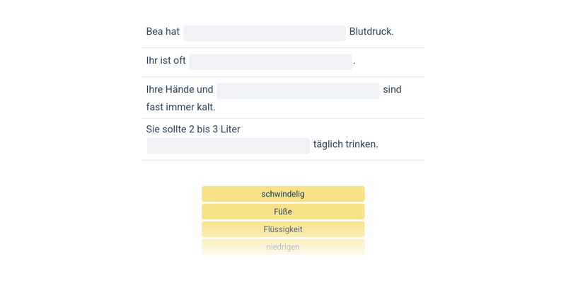 Ćwiczenie na stosowanie słownictwa w praktyce. Każda część składa się z kilku zdań z lukami. Zadanie polega na dopasowaniu podanych słów lub wyrażeń do odpowiednich zdań.